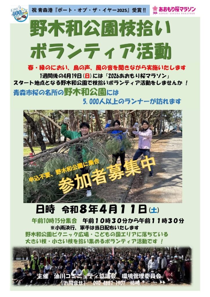 2026年4月12日 / 最終更新日時 : 2026年4月13日 user 暮らし 野木和公園枝拾いボランティア活動 活動開始前から晴れ、雨にあたらず大盛況でした。油川中学生徒の皆さんには運営もやっていただきました。北高の皆さん、青森市民の皆さん、市役所の皆さんありがとうございました。